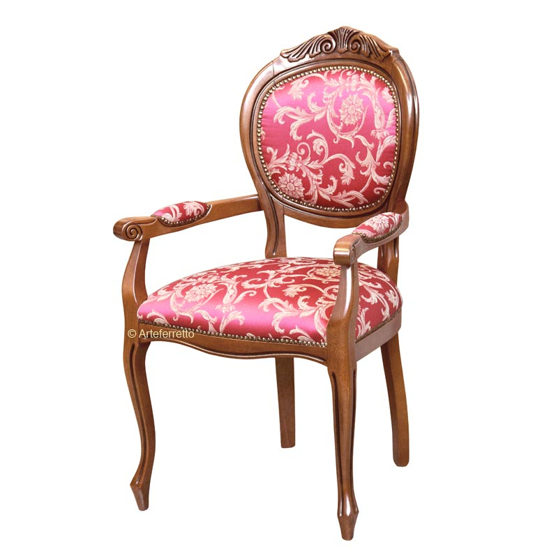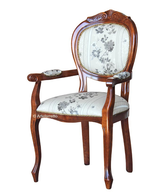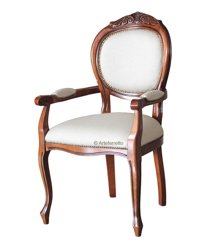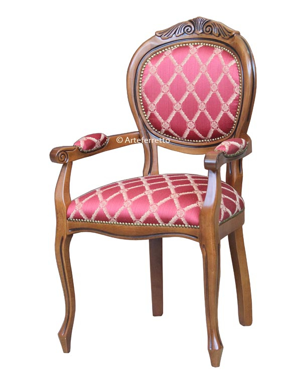 Belle et robuste chaise bout de table enrichie par un gracieux motif décoratif sculpté en haut sur le dossier.