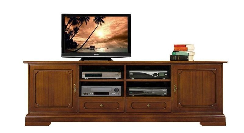 La classicité des ligne simples est présenté parfaitement grâce à ce modèle meuble TV pour salon, extrêmement équilibré avec ses proportions et sa subdivision des espaces.Les lignes essentielles donnent un grand plaisir à la vue et caractérisent le meuble de façon sobre et élégante. La solidité et la robustesse sont garanties par des éléments de grande épaisseur et par une réalisation impeccable.Les étagères en dotation sont tous réglables en hauteur et, au besoin, amovibles.Grand confort enfin est donné par 2 vastes tiroirs et 2 niches renfermées par des portes raffinées (largeur utile: 46,3 cm).Un meuble splendide qui ajoute de la valeur à toute pièce ou il sera placé.Dimensions du meuble:- Totales: L201 x H63,5 x P40 cm- Intérieures des niches ouvertes: L46,4 x H31 x P34 cm- Intérieures des portes : L46,5 x H50 x P34 cm- Intérieures des tiroirs : L40,5 x H11,5 x P32,5 cmDescriptif du meuble:- 2 portes avec étagère réglable en hauteur- 2 niches centrales ouvertes avec 2 étagères réglables pour chacune- Trous passe-câbles- Poids maxi qui peut supporter le meuble tv: 90 KgCaractéristiques du meuble:- Structure, socle et plan supérieur en bois massif tulipier- Panneaux en mdf contre-plaqué, couverts de bois naturel noyer tanganica- Ferrures en métal bronze