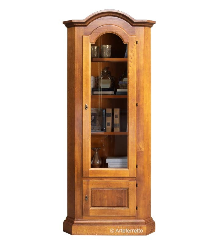 Meuble vitrine d'angle avec 2 portes dont une vitrée. La forme classique est indiquée pour une association à tout contexte d'ameublement.