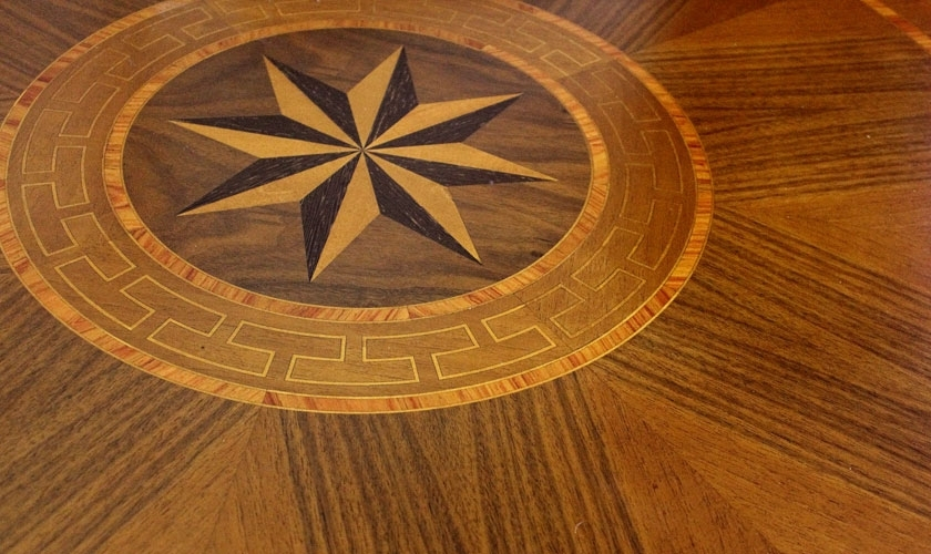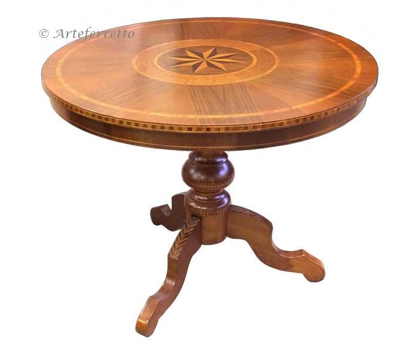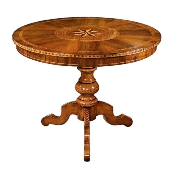 Table ronde fixe marquetée diamètre 90 cm de style purement classique et de très haute qualité artisanale.
