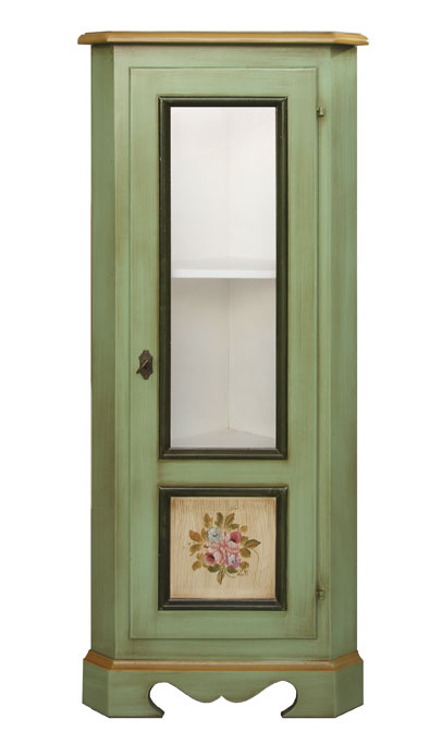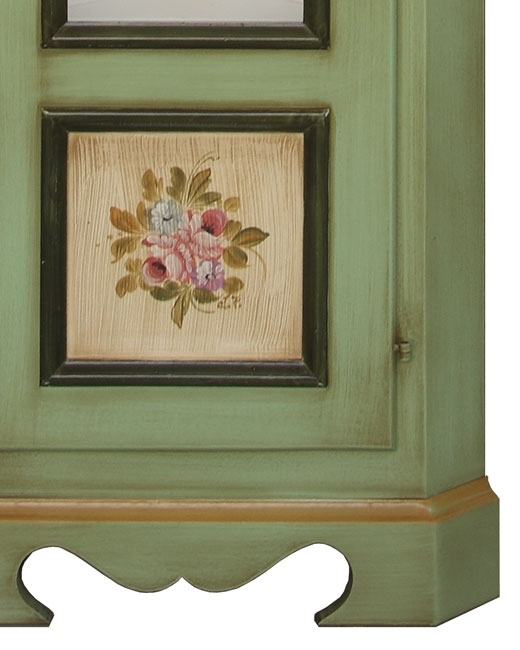 Le plus de ce joli meuble vitrine est représenté par la finition patinée couleur vert et par les éléments floraux peints à la main.