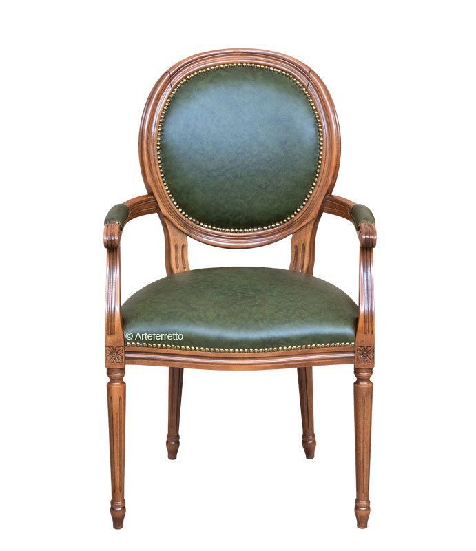 A la structure mise en évidence par un vernissage soigné, on ajoute un travail de tapisserie vraiment très soigné, réalisé à la mains avec cuir véritable bulgare qui se caractérise pour des veines assez visibles.