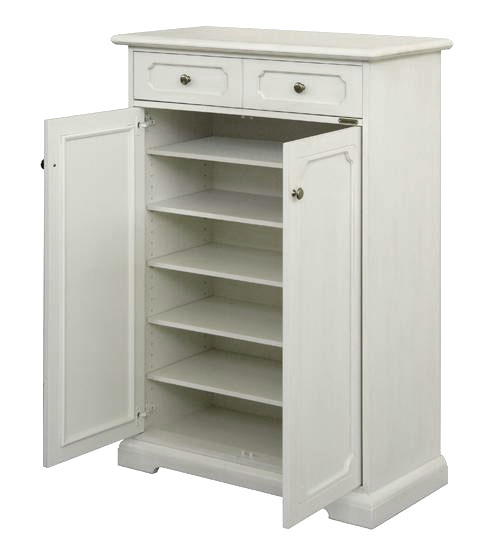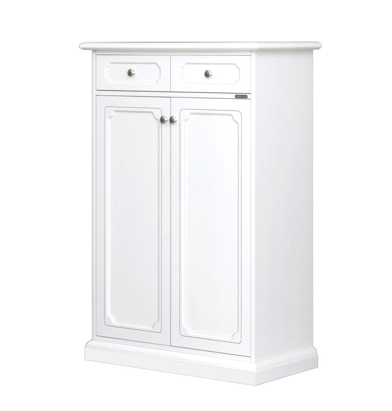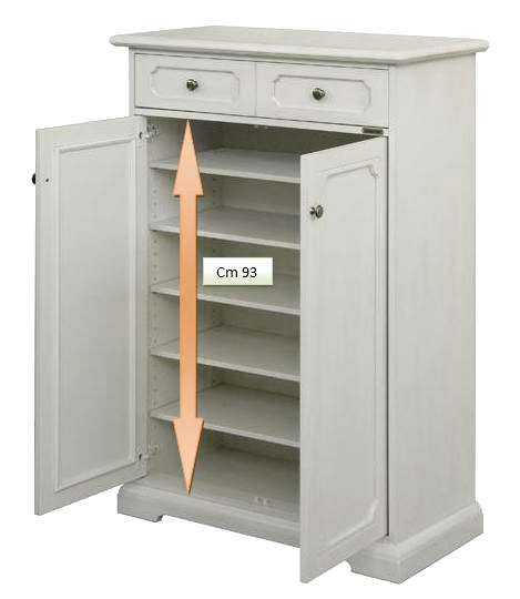 Meuble à chaussures vraiment très fonctionnel, grâce aux 4 abattants.Dans une profondeur de seulement 30 cm, ce meuble peut contenir sans problèmes jusqu'à 24 paires de chaussures: la solidité est assurée par l'essence de bois massif de peuplier utilisée pour la fabrication de ce meuble à chaussures.La finition ivoire vieilli, enrichie avec une délicate décoration sur la façade de chaque abattant et un délicat ornement vert sur le bord du plateau supérieur, ajoute encore plus de valeur à ce meuble incontournable dans toute maison.DimensionsLargeur 80 cm;profondeur 30 cm;hauteur 170 cm.