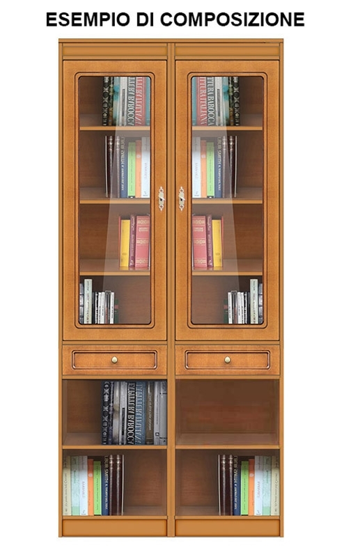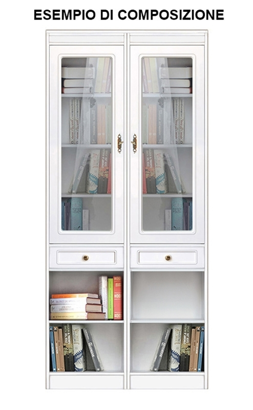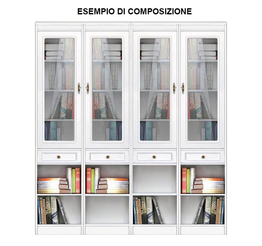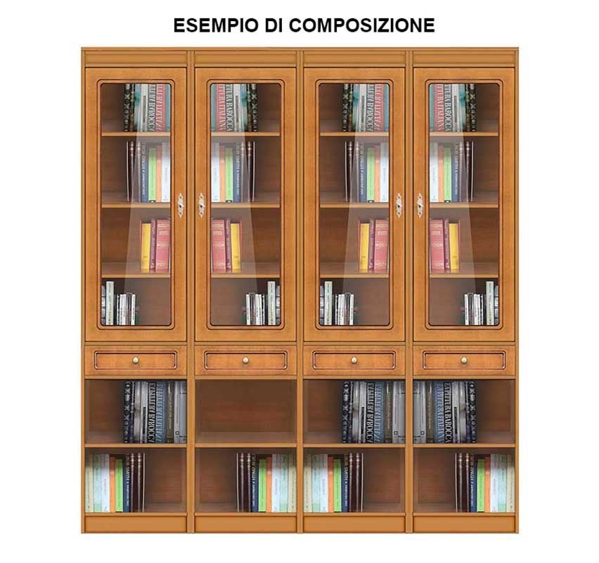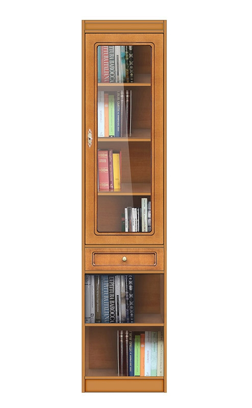 La partie supérieure est fermée par une porte vitrée, en position centrale l'on trouve un tiroir spacieux et tout en bas il y a un compartiment ouvert avec étagère.