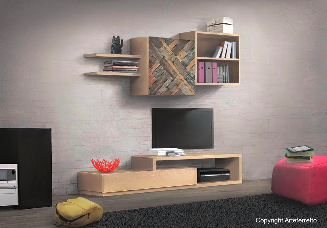 Meuble composition murale finition bois naturel, un exemple d'artisanat moderne réalisé par des experts ébénistes avec matériaux de premier choix.