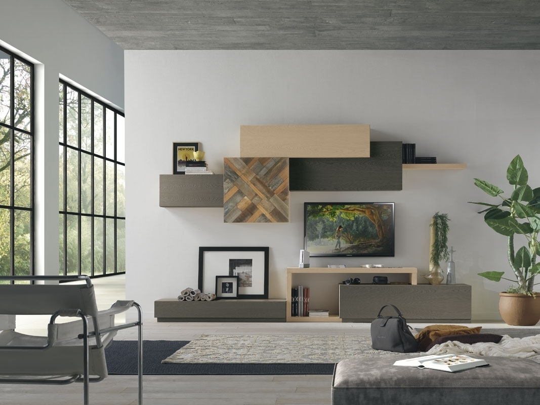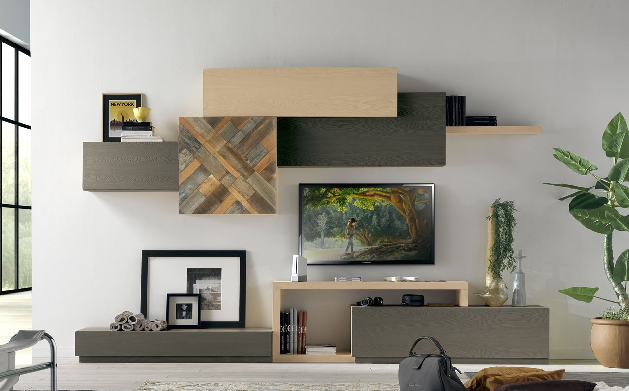 Meuble mural pour living, style contemporain, grand et fonctionnel grâce au nombre d'éléments qui le constituent.