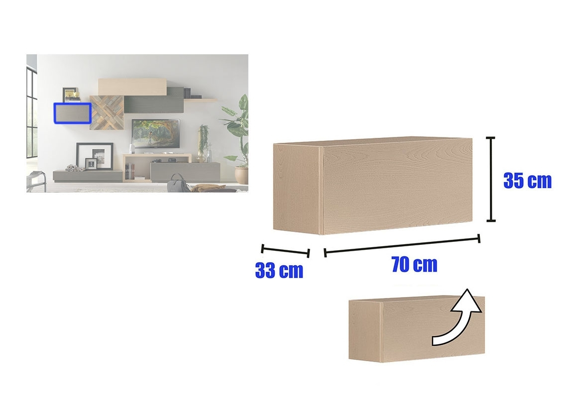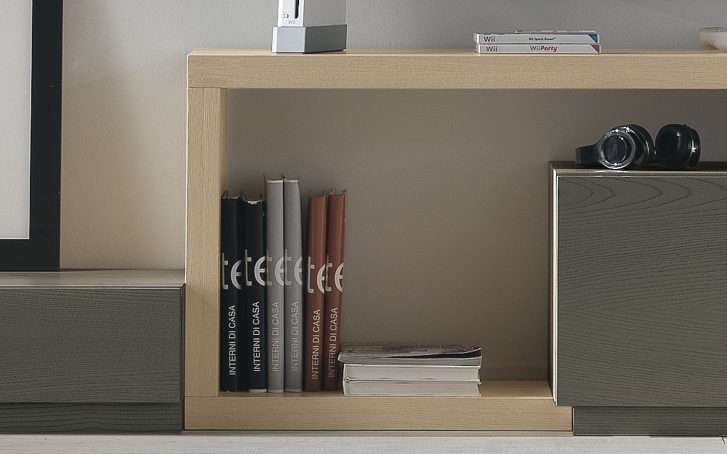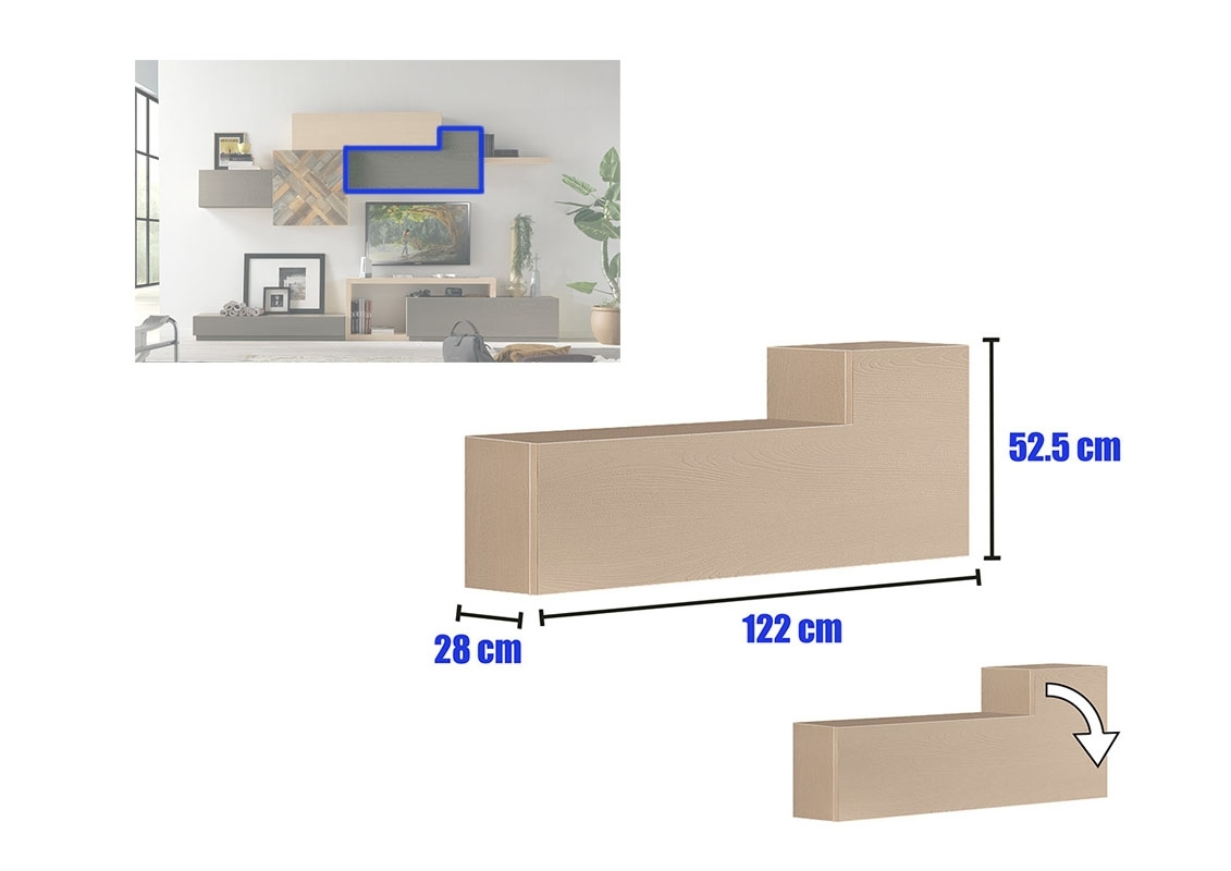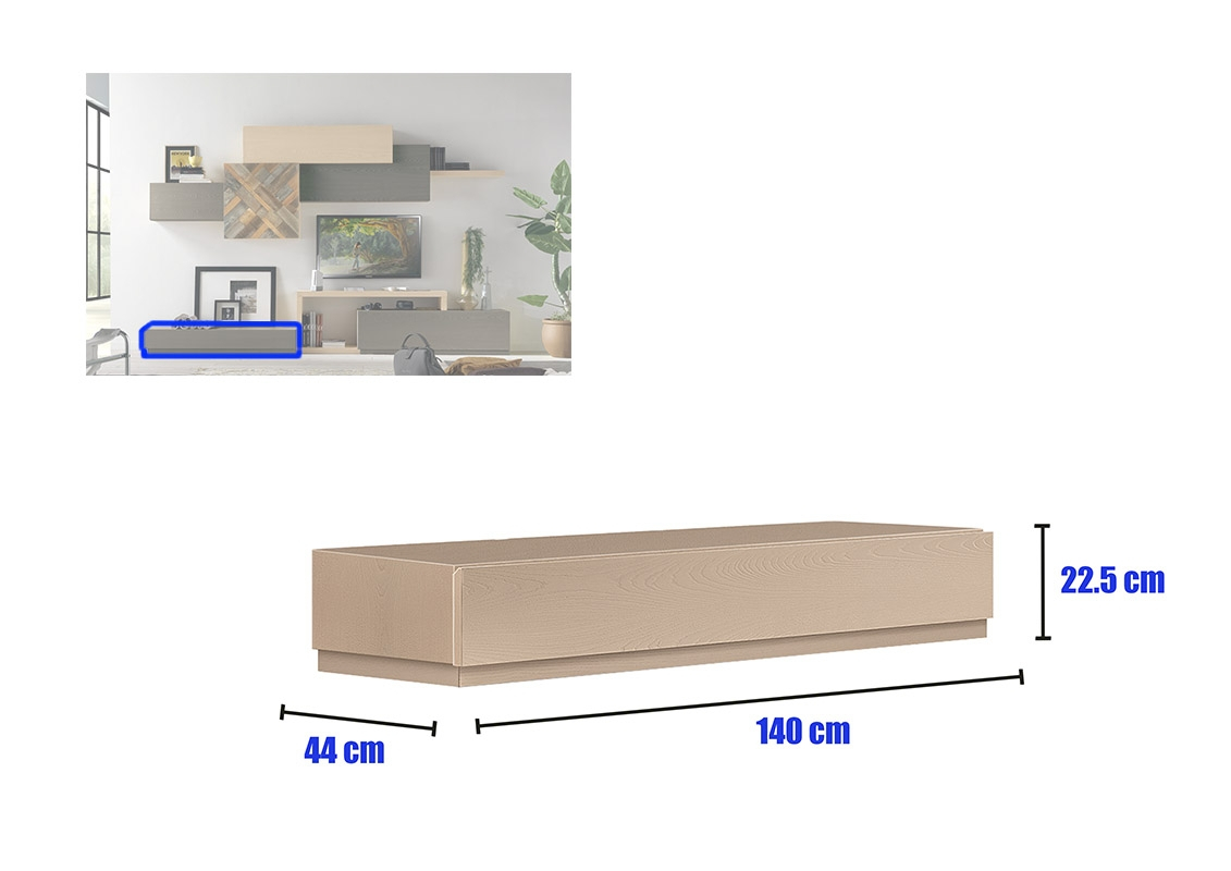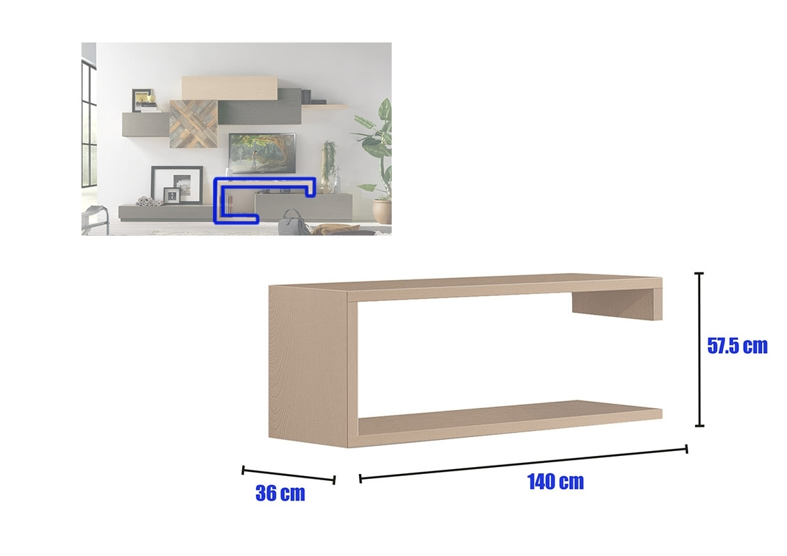 Tous les corps composant ce meuble mural pour living offrent beaucoup d'espace de rangement et s'intègrent parfaitement entre eux.