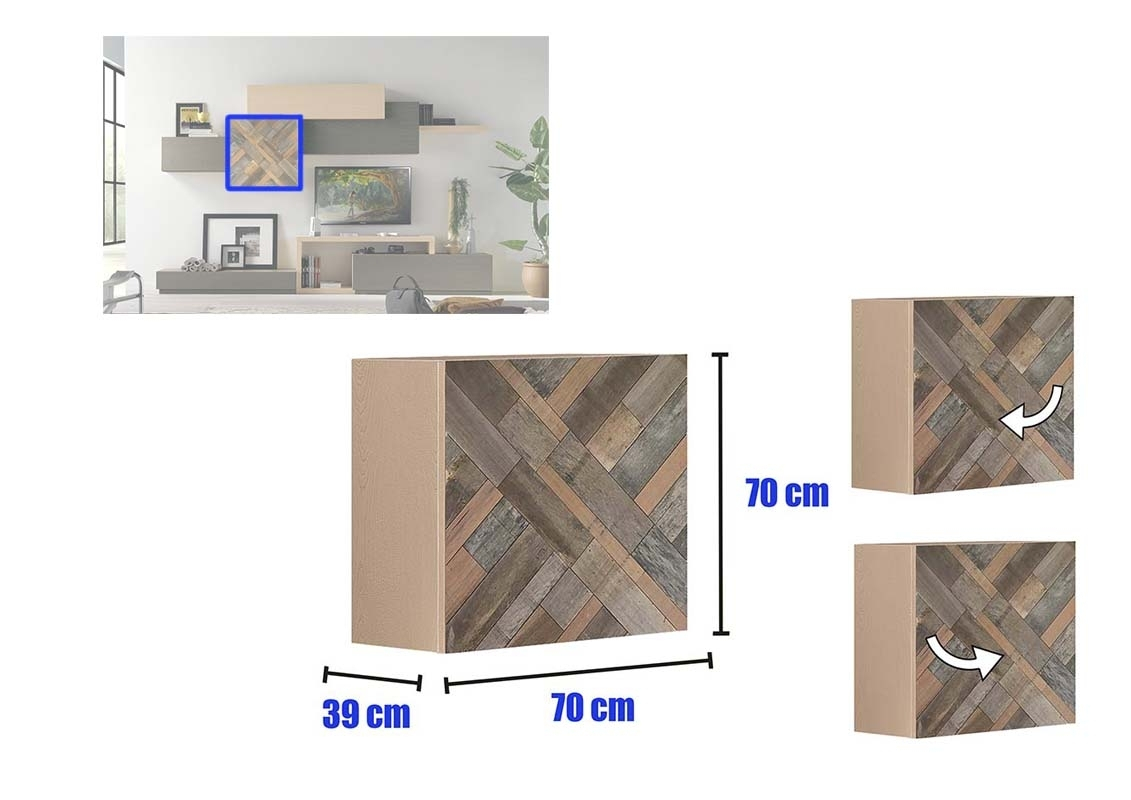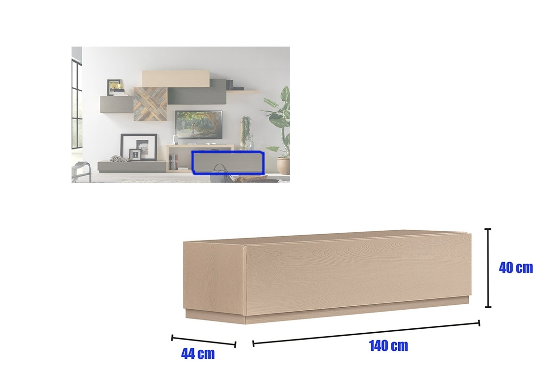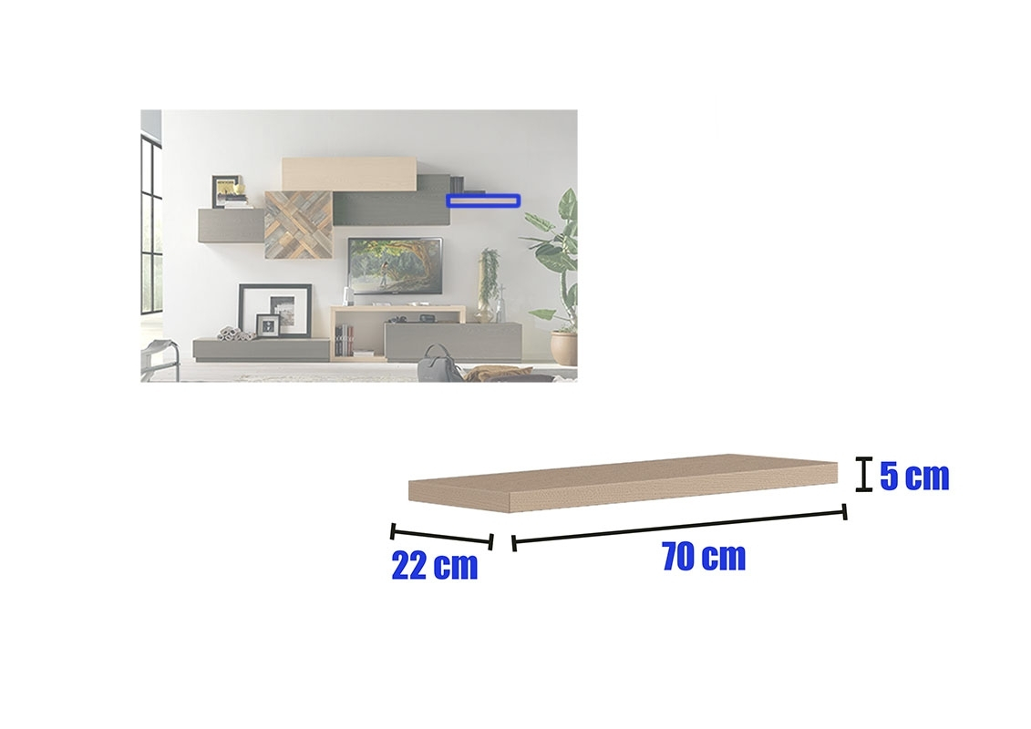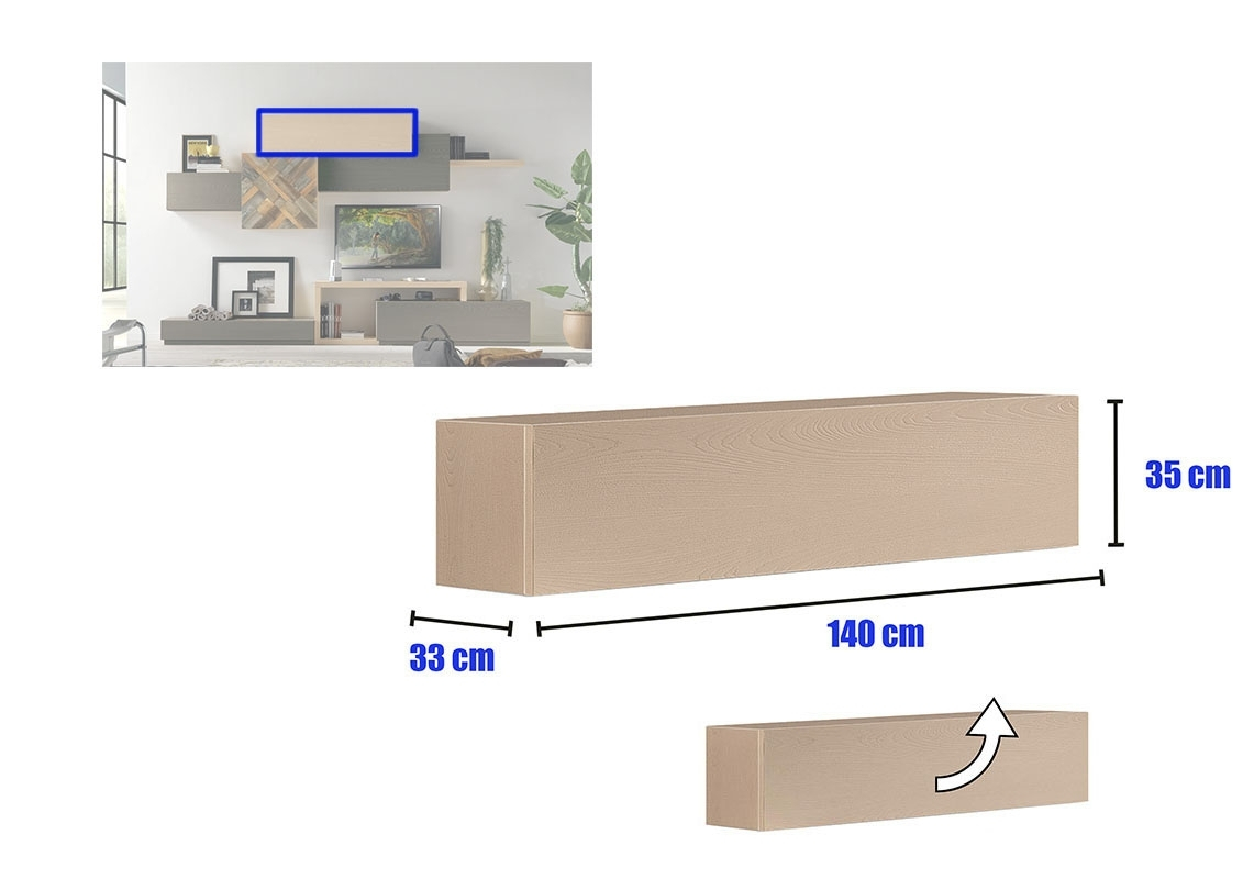 Tous les corps composant ce meuble mural pour living offrent beaucoup d'espace de rangement et s'intègrent parfaitement entre eux.