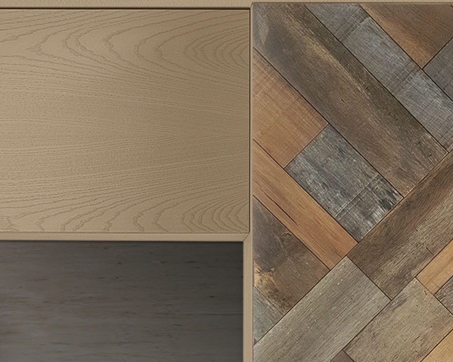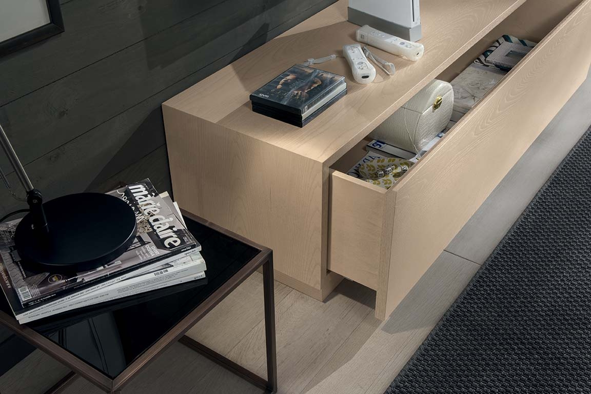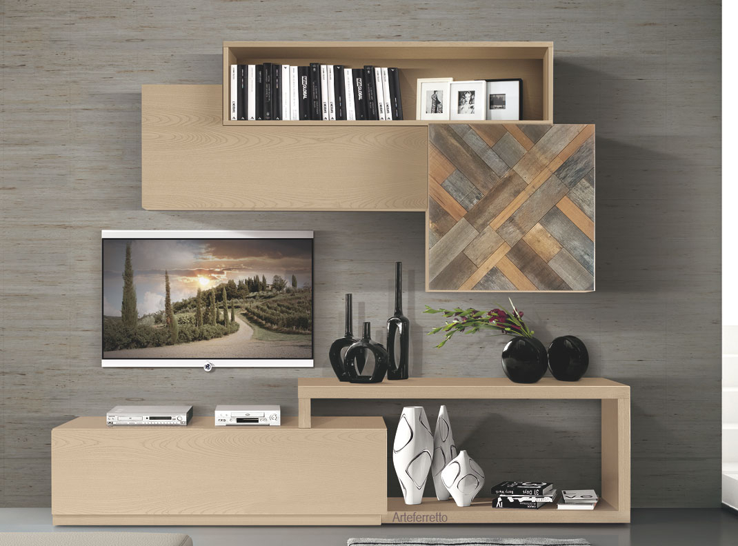 Meuble composition murale finition bois naturel, un exemple d'artisanat moderne réalisé par des experts ébénistes avec matériaux de premier choix.