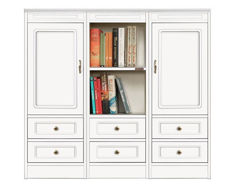 Un espace important (hauteur utile 59 cm) est renfermé à droit et à gauche par des portes élégantes; la niche centrale ouverte donne la possibilité de l'exploiter en tant que bibliothèque ou exposition d'objets décoratifs. Les tablettes fornies en dotation sont réglables en hauteur et amovibles au besoin.