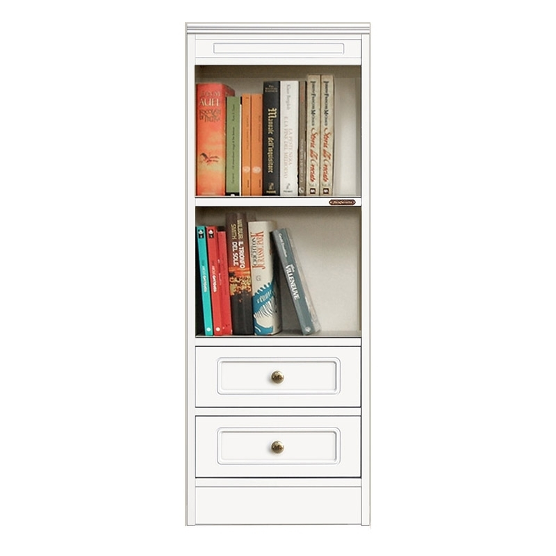 Module bibliothèque avec 2 tiroirs et niche. L'espace consacré au rangement des livrers est équipé d'une tablette réglable en hauteur. L'hauteur totale de la niche ouverte est de 59,1 cm.