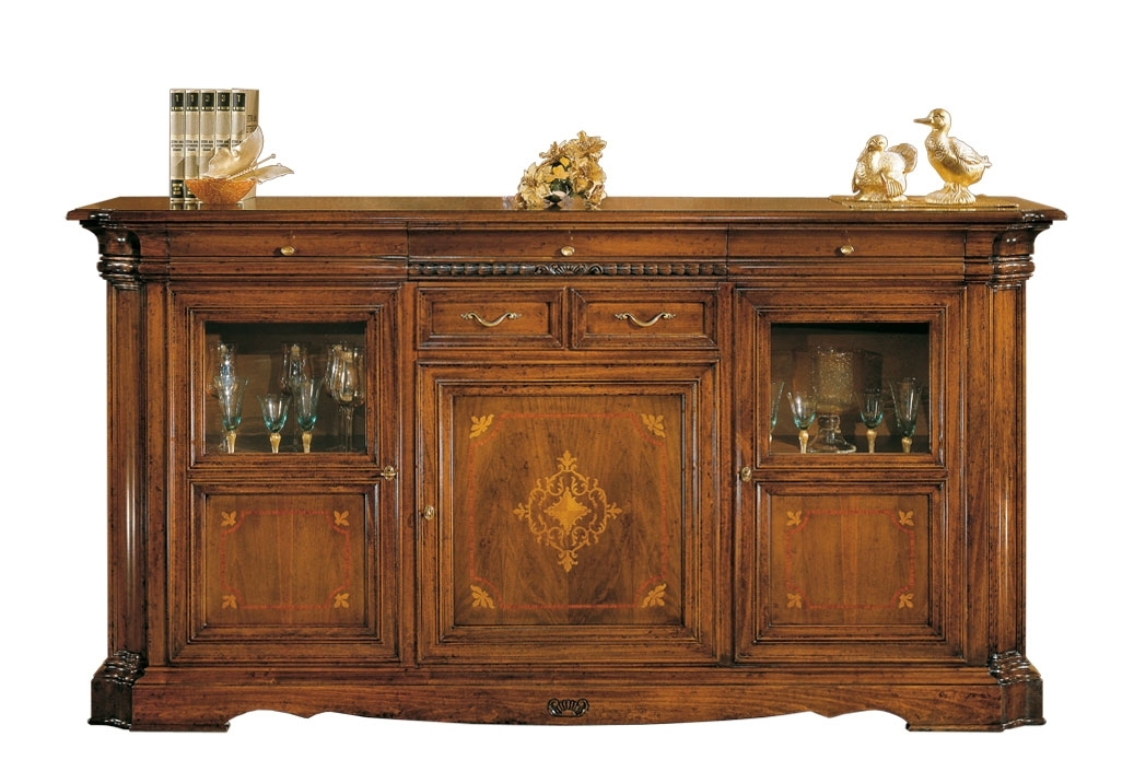 Ce meuble buffet enfilade 220 cm est enrichi par un raffiné travail de marqueterie sur les façades des portes.
