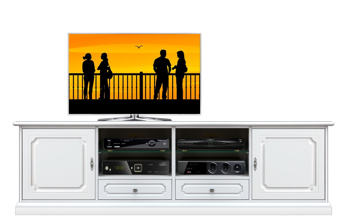 Meuble de télévision 200 cm de fabrication artisanale qui se révèle très pratique pour ses rangements. Tout espace saura s'adapter à vos exigences grâce aux étagères réglables en hauteur. Aussi, les trous passe-câbles facilitera les branchements.