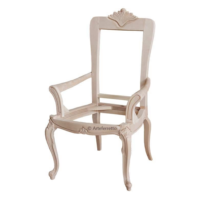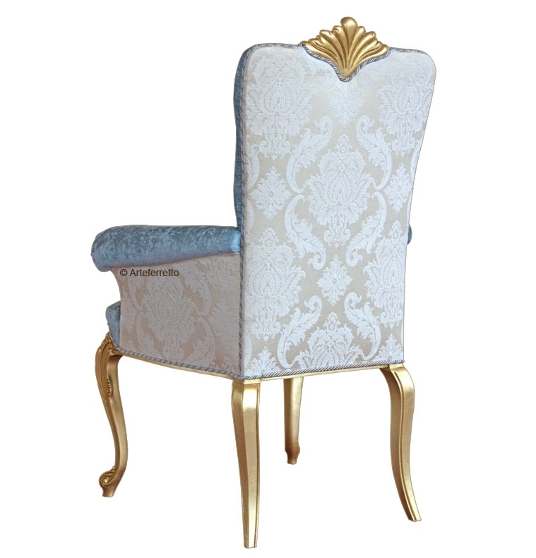L'aspect classique est donné par le travail capitonné du dos, réalisé avec un tissu qui met très bien en relief les courbures de la structure, et par le motif sculpté et doré en haut. Extérieurement et sur la partie postérieure du dos, une magnifique étoffe damassée donne une touche de vivacité à cette chaise très élégante.
