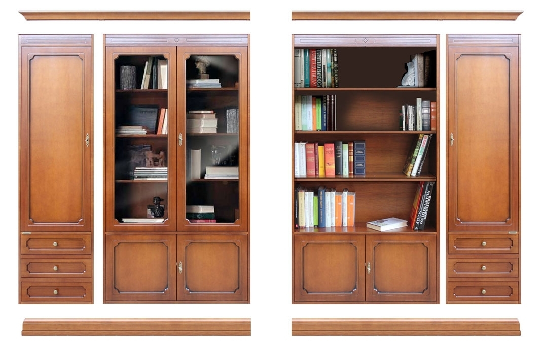 La partie centrale se caractérise par un module avec portes vitrées et un avec étagères.