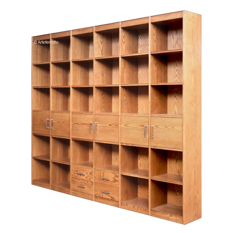 Grande bibliothèque à 4 portes de style contemporain. Structure en frêne massif, caractérisée par des lignes fraîches et épurées et par des détails originaux tels que la sculpture géométrique des portes en bois et le fraisage des poignées des portes en verre.