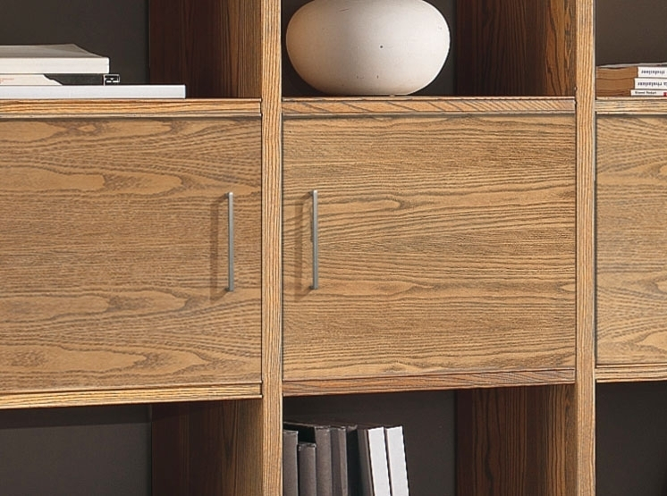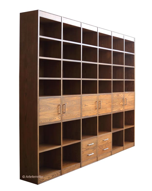 Grande bibliothèque à 4 portes de style contemporain. Structure en frêne massif, caractérisée par des lignes fraîches et épurées et par des détails originaux tels que la sculpture géométrique des portes en bois et le fraisage des poignées des portes en verre.