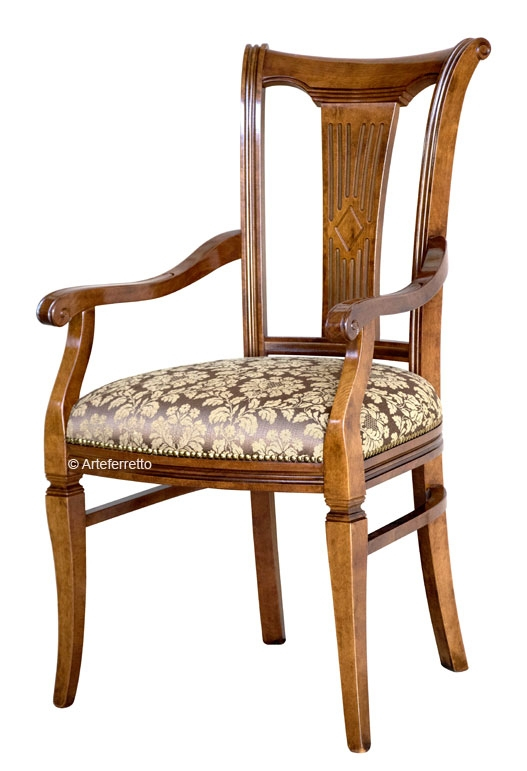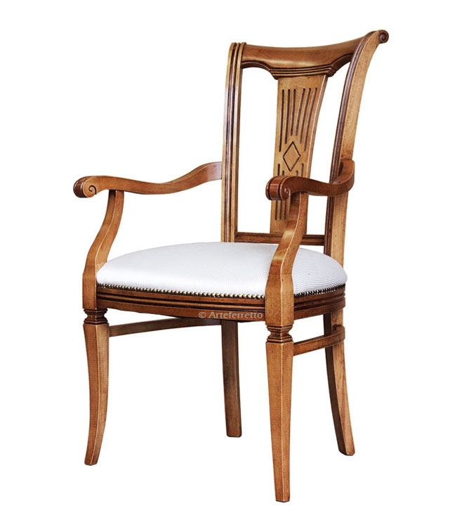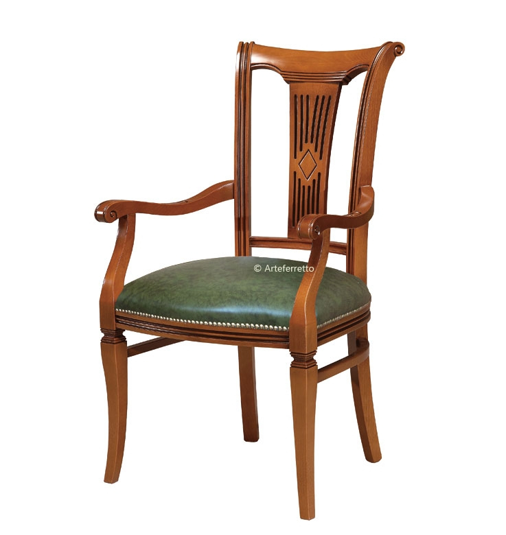Chaise bout de table stylisée en bois massif qui présente une silhouette intéressante et une assise confortable aidée par des accoudoirs anatomiques.
