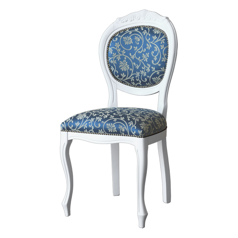 Sa ligne épurée est valorisée par un motif sculpté sur bois dans la partie supérieure du dossier.