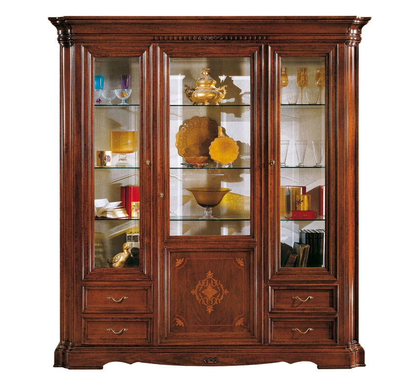 La fabrication de cette vitrine argentier suit les canons des anciennes traditions artisanales. Un meuble valorisé par l'utilisation de matériaux haut de gamme et par un précieux travail de marqueterie.