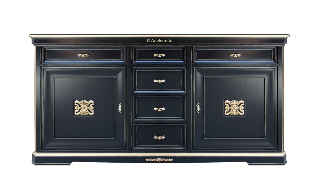 Meuble buffet classique imposant "Old classic", qui associe à une structure d'une qualité et solidité exceptionnelle, une finition laquée noire vieillie avec détails à la feuille d'or.