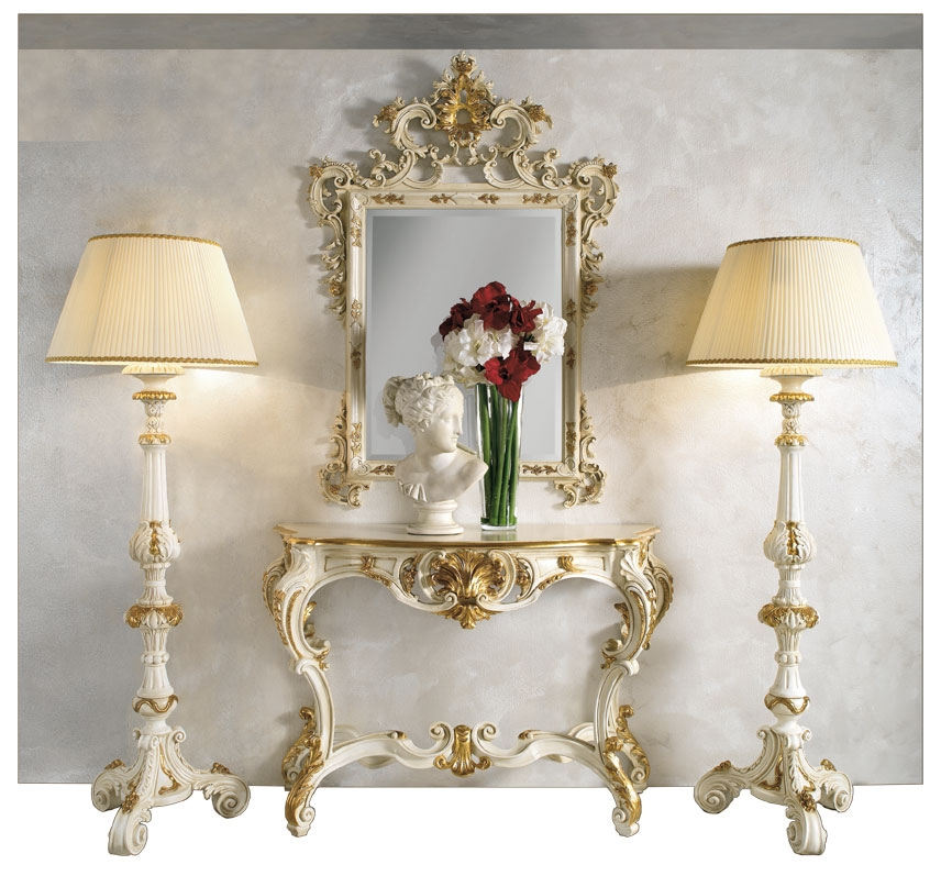 La console faisant partie de cette composition est robuste, solide et finement ciselée. Ses dimensions généreuses font office de support pour le magnifique miroir sculpté et décoré en feuille d'or qui se fond à la perfection avec le vernissage de qualité supérieure.
