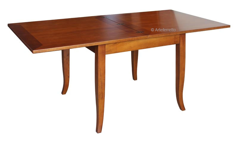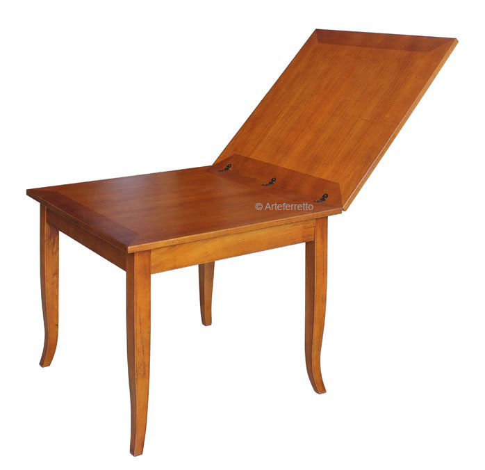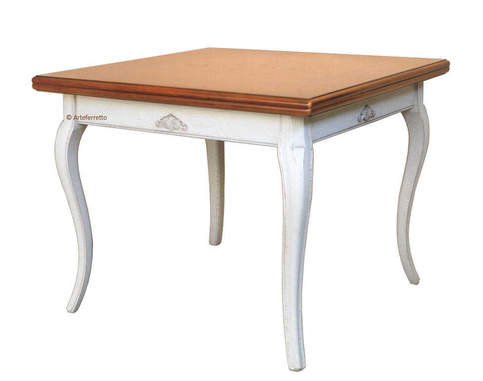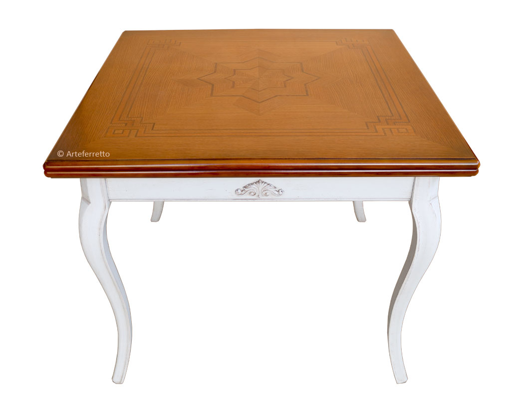Dans sa configuration fermée, la table a un plateau carré de 120 cm. Grâce à sa structure résistante, elle révèle toute sa robustesse aussi dans sa configuration ouverte : les rallonges logées sous le plateau permettent de garder inchangée la forme du motif marqueté, en le doublant.