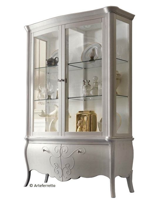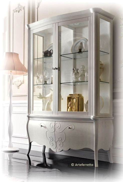 Style original et haute qualité pour ce meuble vitrine vraiment unique, divisée en un espace avec portes et étagères vitrées, et un espace en bas avec des portes très élégantes en bois. La silhouette originale du meuble se mélange avec les sinueux motifs en relief qui contribuent à décorer doucement l'ensemble.