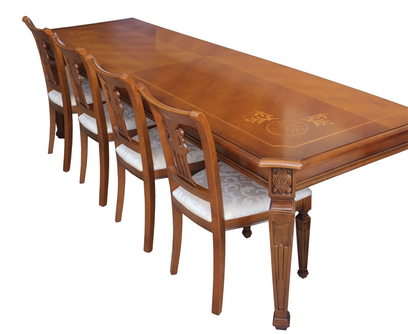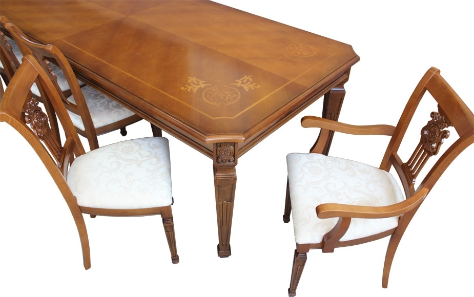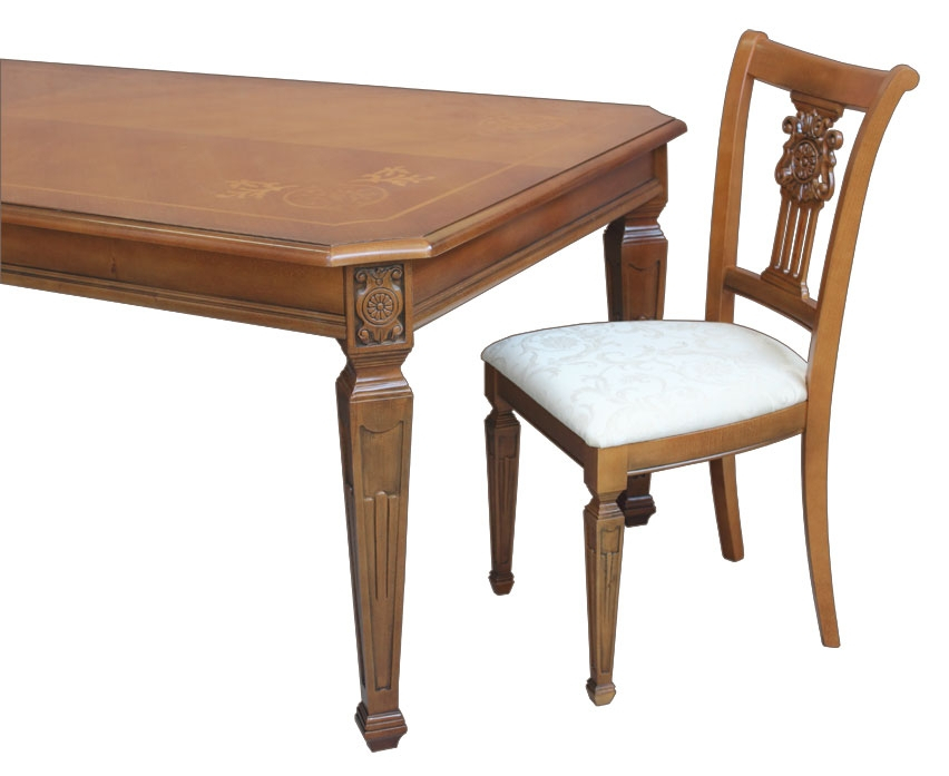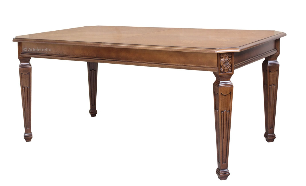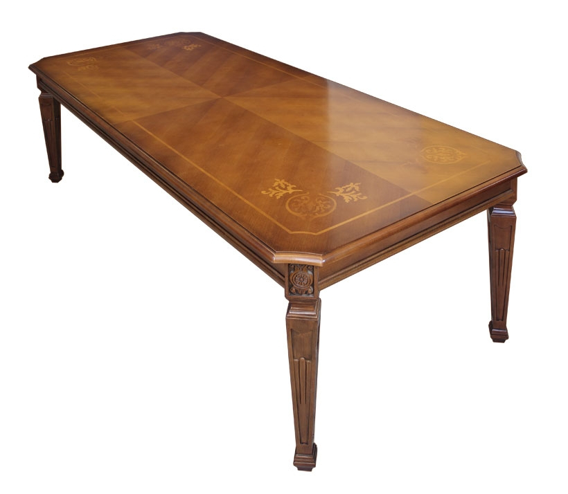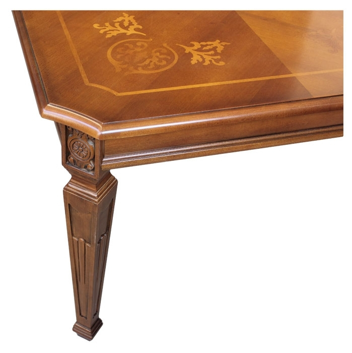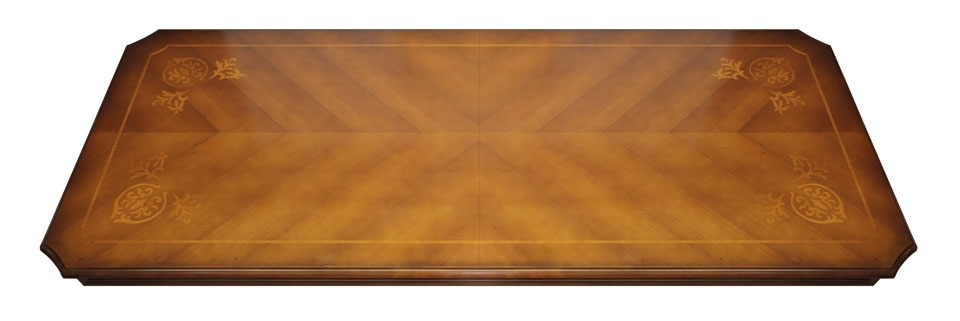 Le plateau, grâce à un aspect particulier des veines du bois et à un travail de marqueterie de grande élégance, est mis en relief par le beau vernissage qui transmet toute la chaleur du bois naturel.