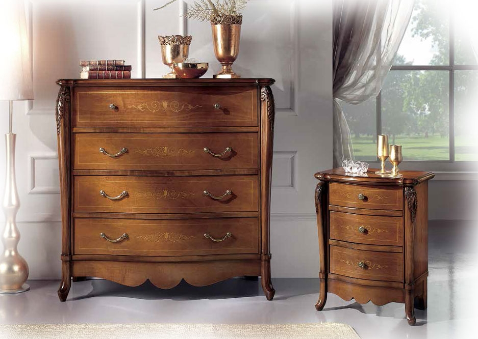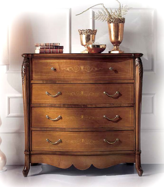 On trouve grande élégance et raffinement même sur le travail de marqueterie qui caractérise la façade des tiroirs de la commode.