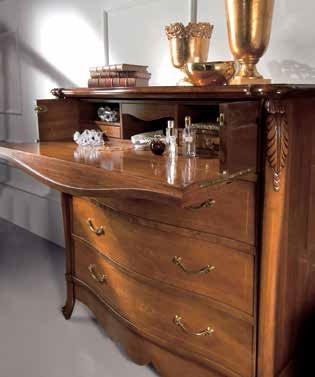 Trois vastes tiroirs en bas et un abattant en haut renfermant une niche de grande utilité et beauté, offrent un grand espace. En plus d'un très utile plateau d'appui, cette commode est équipée de petits tiroirs et niches qui permettent de ranger tout petit objet.