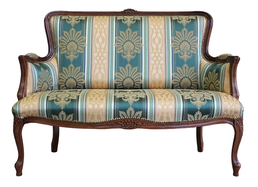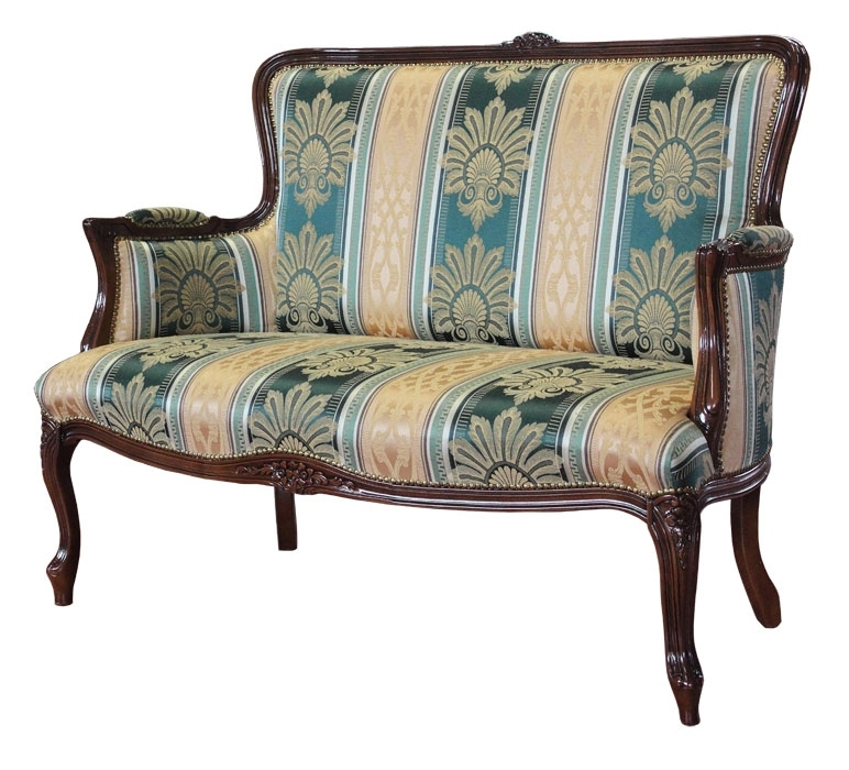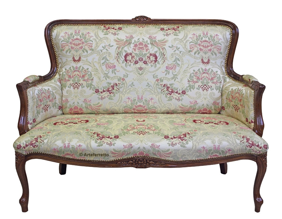 Canapé deux places de style, sagement tapissé et caractérisé par une solide armature en bois de hêtre sculpté.