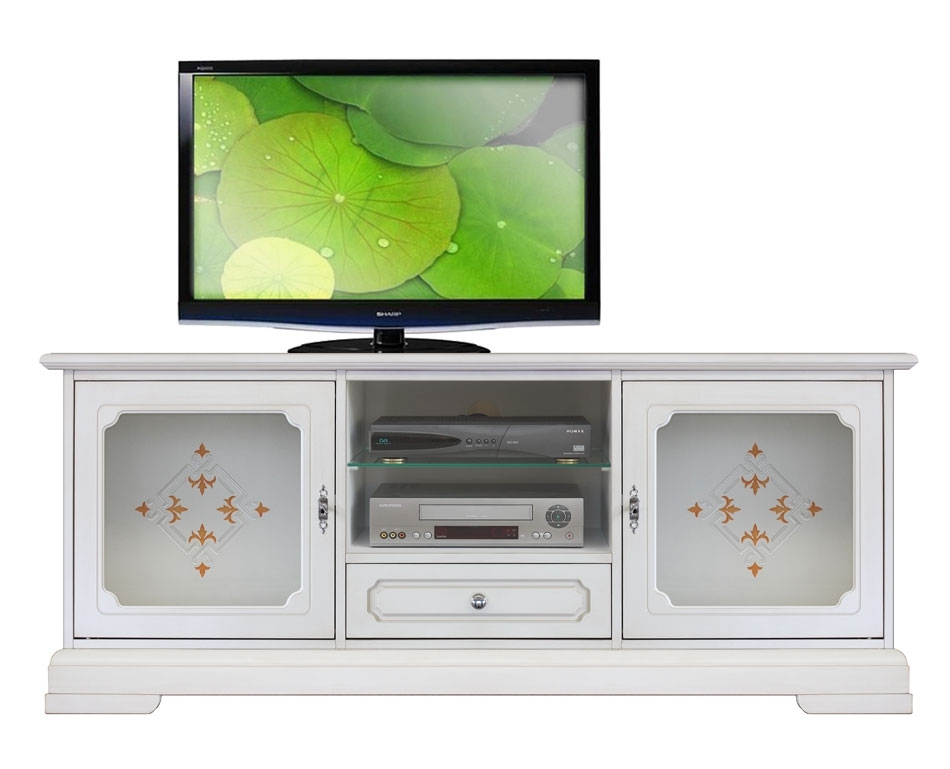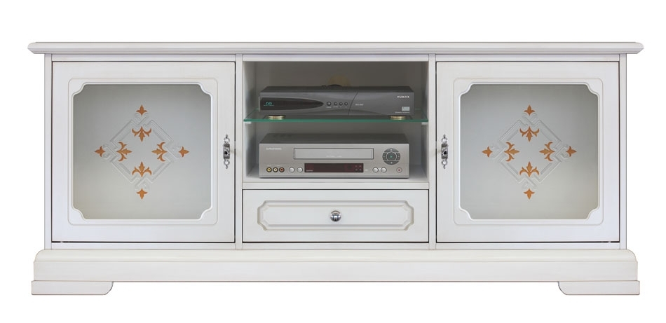 Magnifique meuble TV, élégant et raffiné. Sa ligne simple est mise en relief par la finition claire où l'originale vitre dépolie se distingue pour l'élégance de ses décorations.