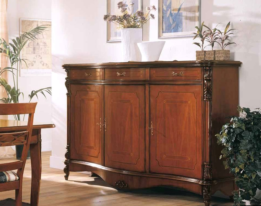 Buffet marqueté et sculpté. La structure imposante et très riche en détails prisés et de style, rend ce meuble parfait pour une pièce élégante et classique: les portes, à la forme sinueuse, renferment un large espace optimisé, à l'intérieur, par des étagères robustes et solides; trois confortables tiroirs reprennent le raffiné travail de marqueterie des portes. Les côtés doux et arrondis s'associent parfaitement avec les profil captivants.