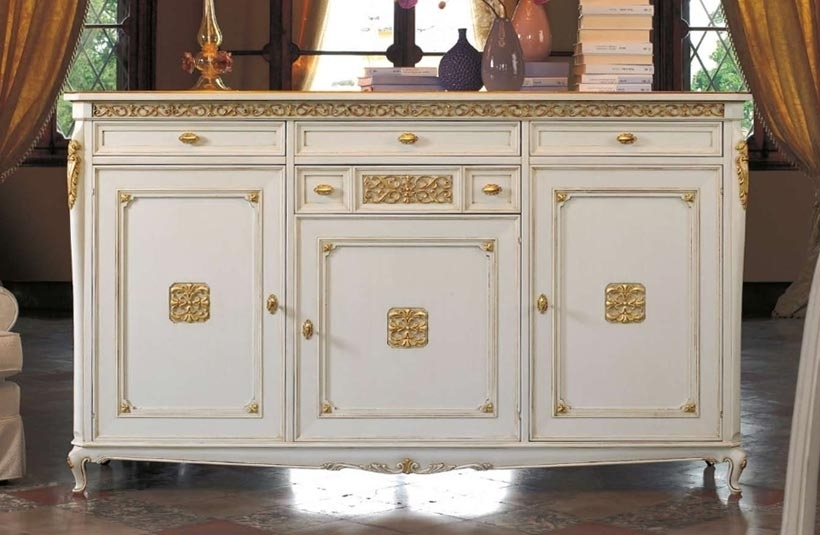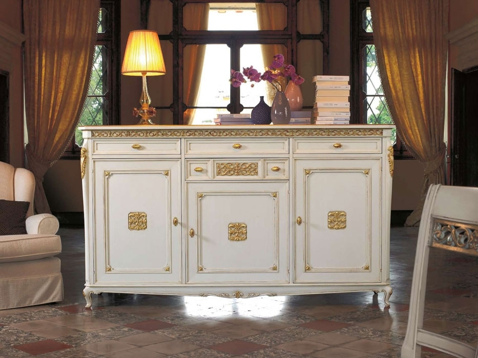 Buffet classique laqué avec 3 portes et 4 tiroirs. Son aspect imposant est parfaitement soulagé par les pieds modelés et par une finition laquée vieillie avec détails à la feuille d'or qui le rende un objet d'ameublement vraiment originel et très élégant.