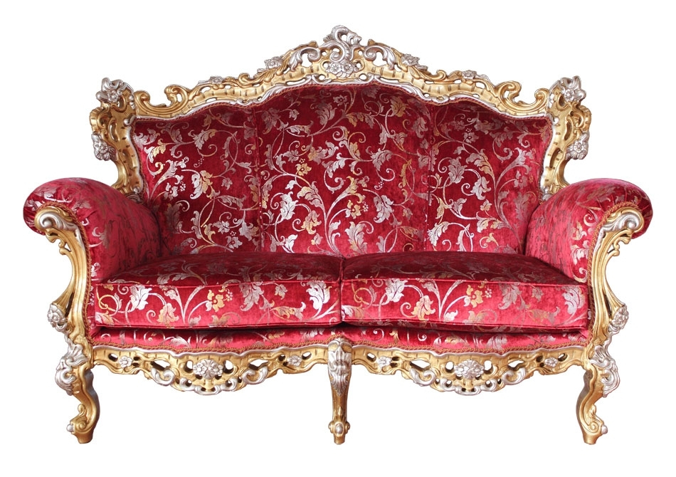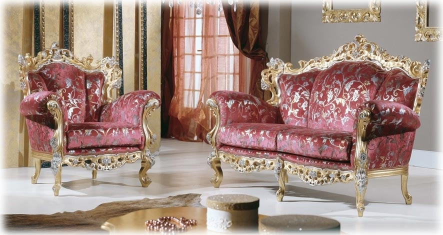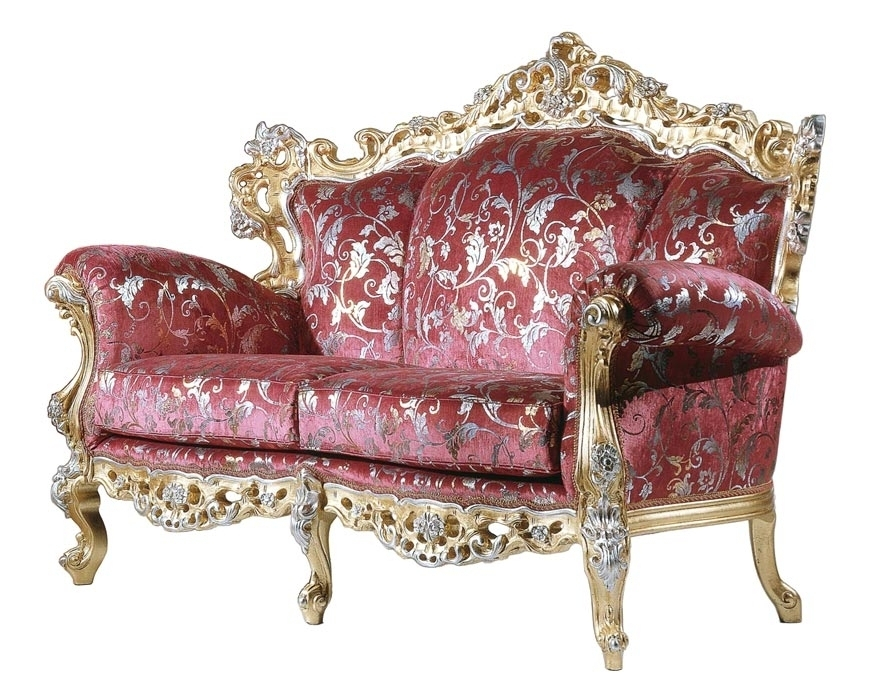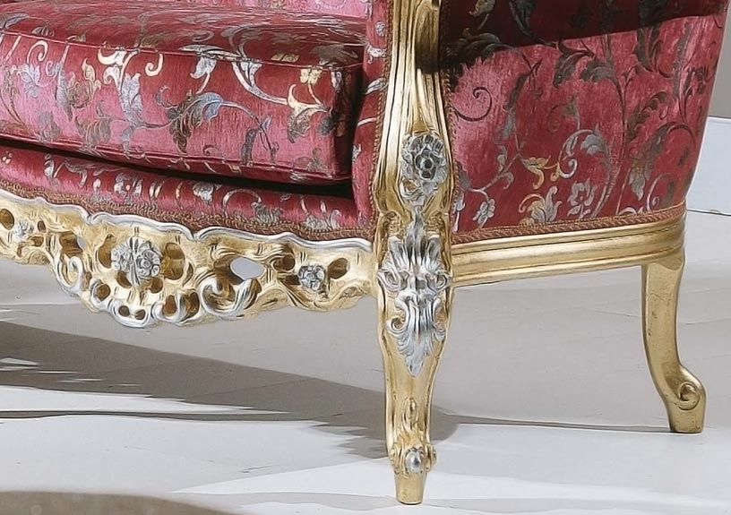 Canapé spectaculaire et extrêmement luxueux avec une structure habilement sculptée, enrichie par des raffinées gravures décoratives mis en relief par une finition en feuille d'or et argent.