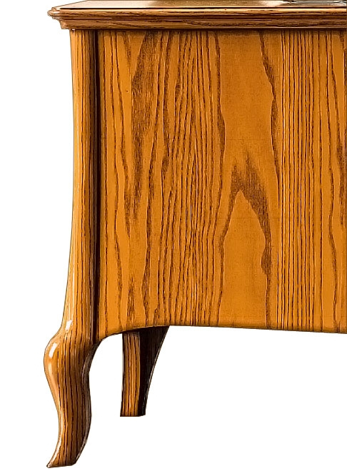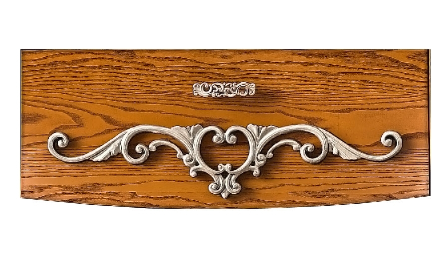 Dans la partie centrale, le meuble présente un compartiment ouvert utile et un tiroir enrichi d'une motif décoré stylisé. L'aspect fonctionnel est enfin complété par 2 tiroirs disposés latéralement.