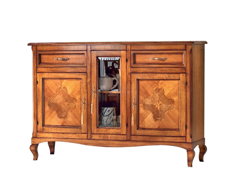 Meuble buffet 165 cm riche en éléments de haute valeur, comme le travail de marqueterie qui caractérise les portes. Différents essence de bois, combinées de façon artistique, créent des formes originales et très agréables.