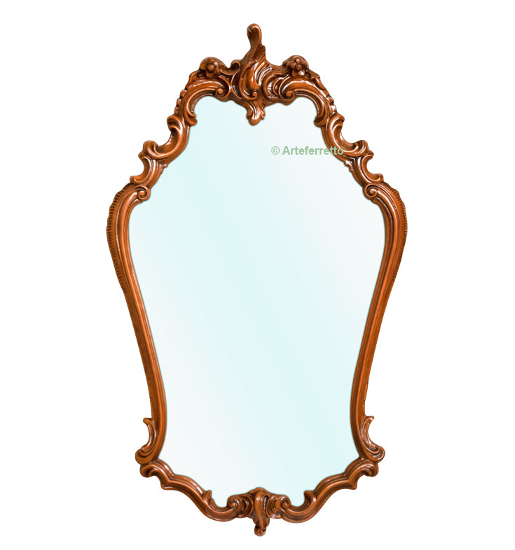 Le miroir, élégant et aux lignes sinueuses, est un triomphe de sculptures valorisées elles-aussi par l'application de la feuille d'or.