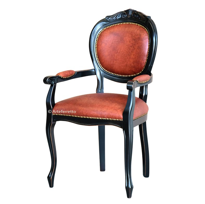 Sa ligne épurée est valorisée par un motif sculpté sur bois dans la partie supérieure du dossier.