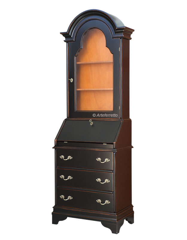 La beauté de la structure est mise en évidence par une finition bicolore composée par pieds, tiroirs et dessous du plateau en couleur laquée vieillie (blanc, noir ou ivoire) et le top en finition classique idéale pour valoriser la marqueterie géometrique sur le bois de noyer tanganica.