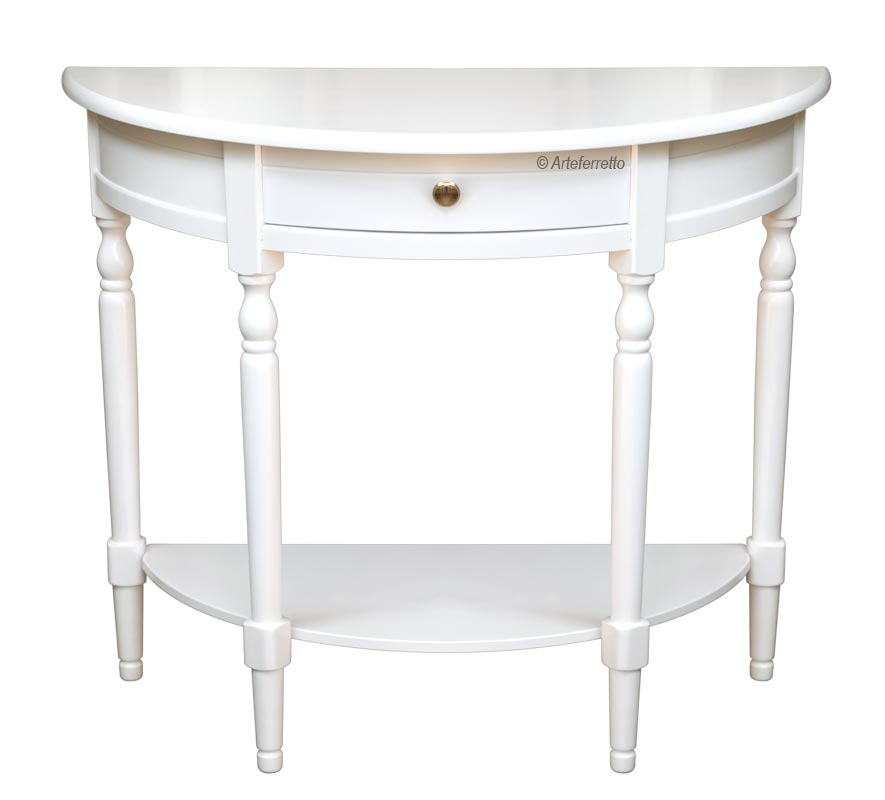 Console classique demi-lune équipée d'un tiroir et d'un table dans la partie inférieure.