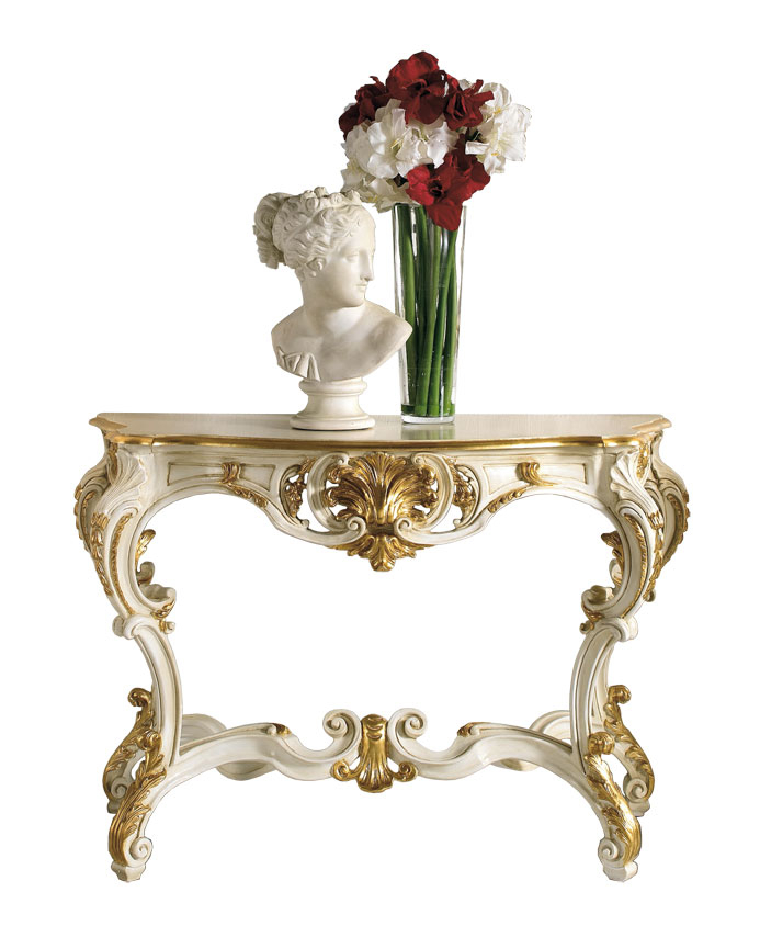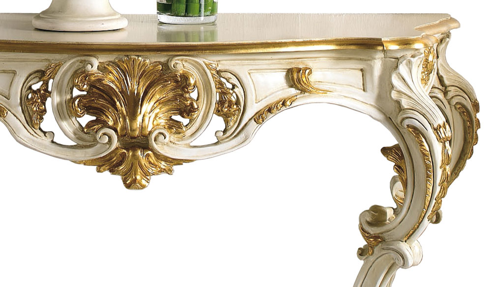 Du travail de sculpture sur bois de hêtre à la peinture effet vieilli, en passant par l'application de la feuille d'or : des éléments de haute valeur qui rendent cette console un objet exclusif et haut de gamme.
