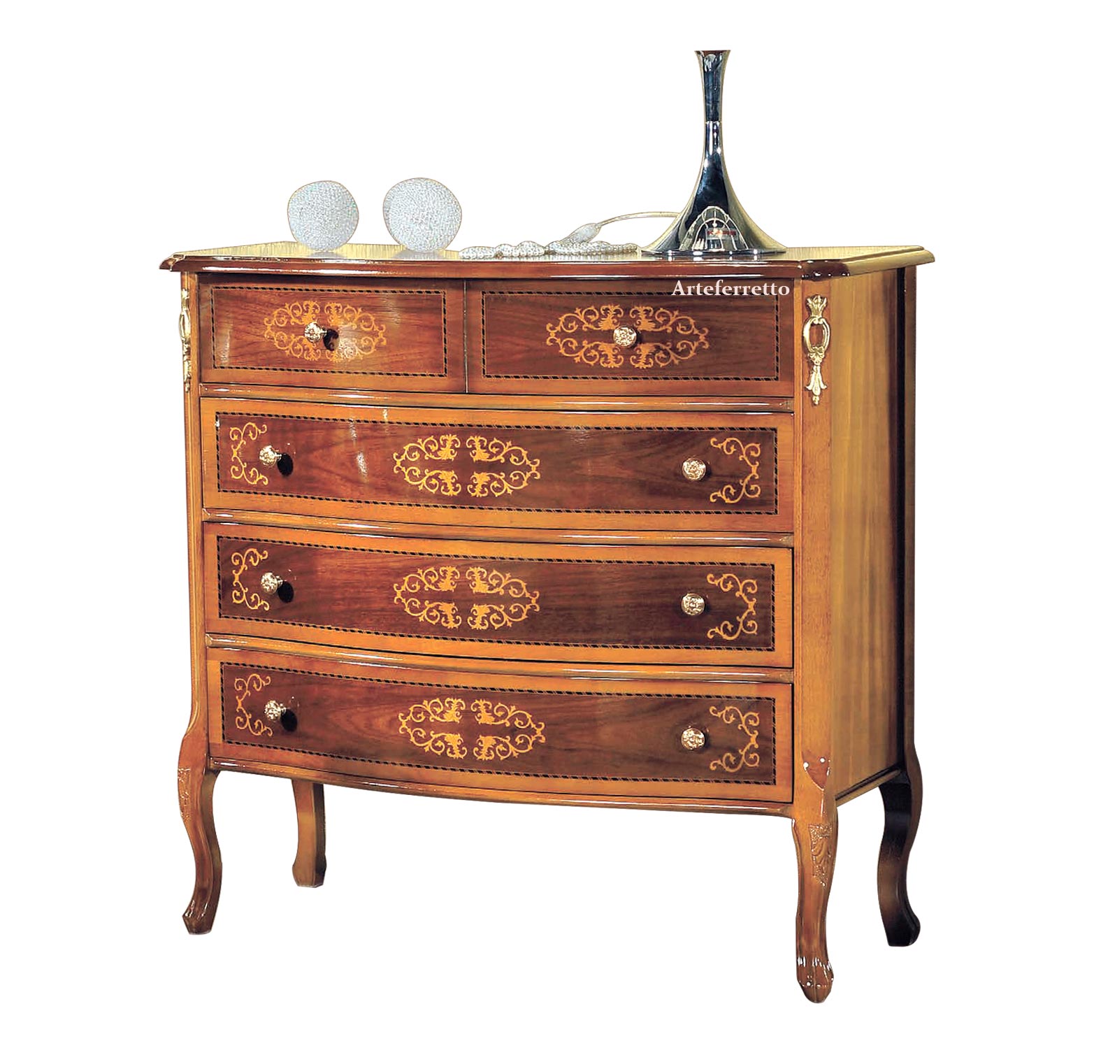 Les matériaux utilisés, de tout première qualité, sont modelés avec soin extrême par des habiles artisans qui utilisent des procedures traditionnelles tout en rendant cette commode un chef d'oeuvre de l'artisanat de la Vénétie.