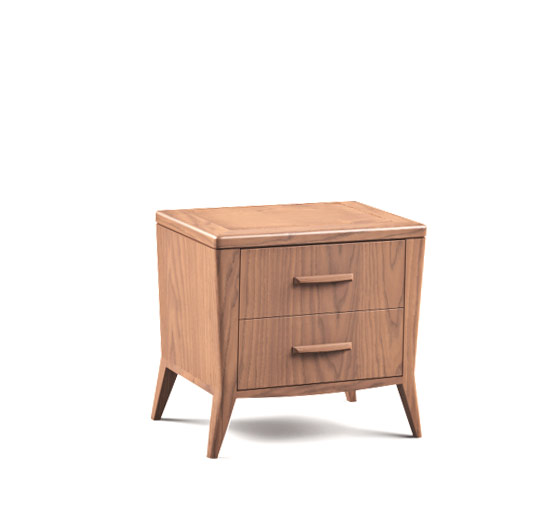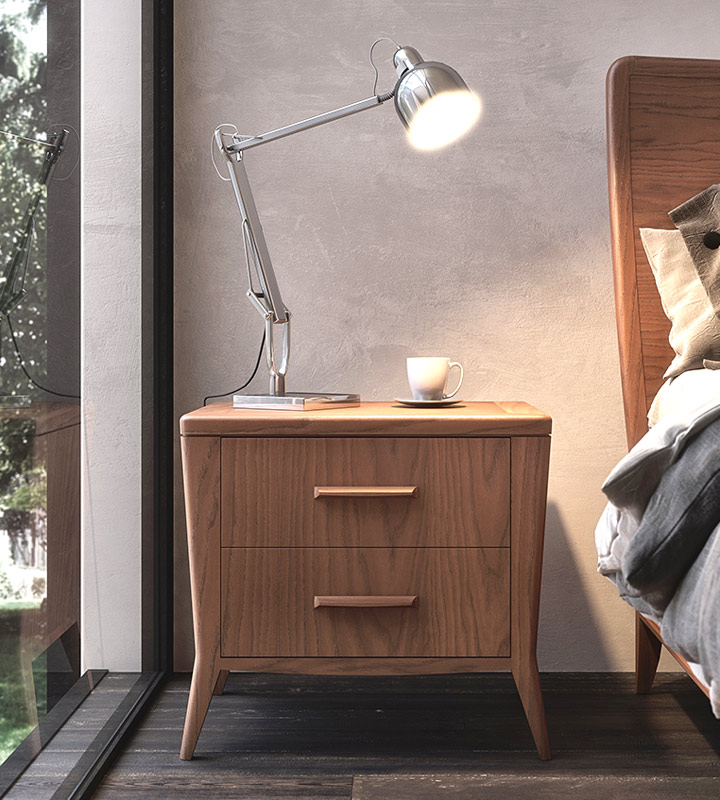 Table de chevet pour chambre à coucher très fonctionnelle et spacieuse grâce à deux tiroirs à fermeture amortie.