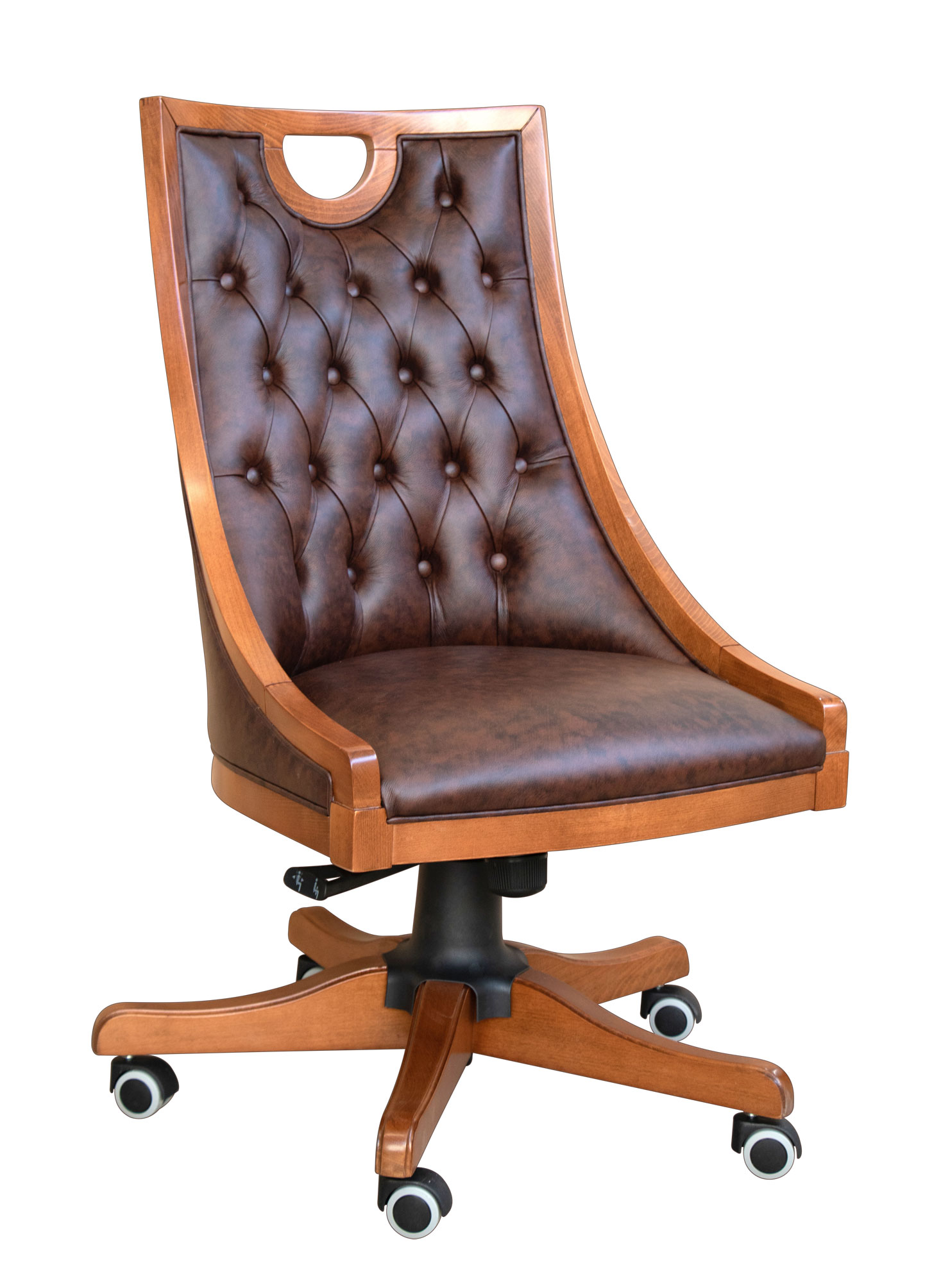 Fauteuil de direction cuir et bois, tournant et soigné dans les moindres détails, fiable et robuste pour se maintenir au fil du temps.