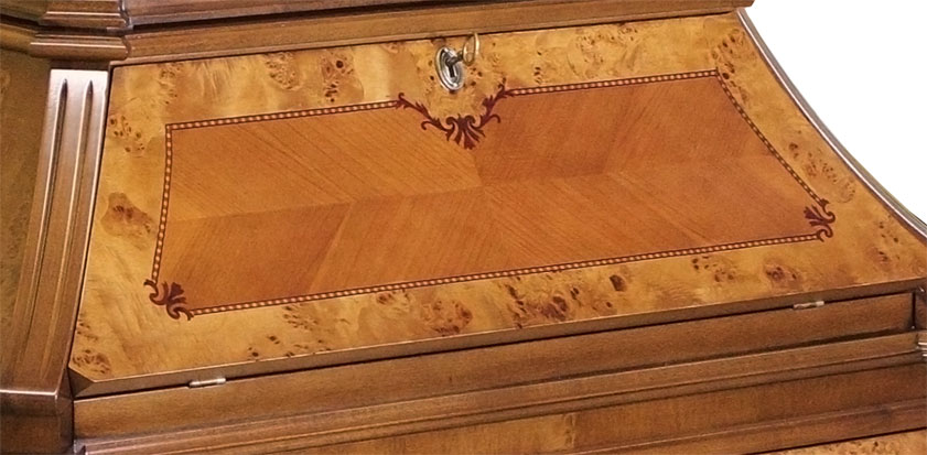 La partie intérieure du contour délicat est une marqueterie qui joue avec le grain du bois, créant un effet spectaculaire.