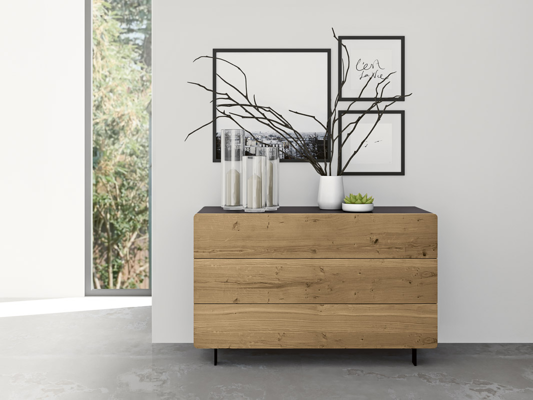 La structure du buffet est composée de panneaux MDF laqués de couleur charbon de bois. Les portes, également de couleur charbon, sont finies avec des bandes de chêne nordique noueux.