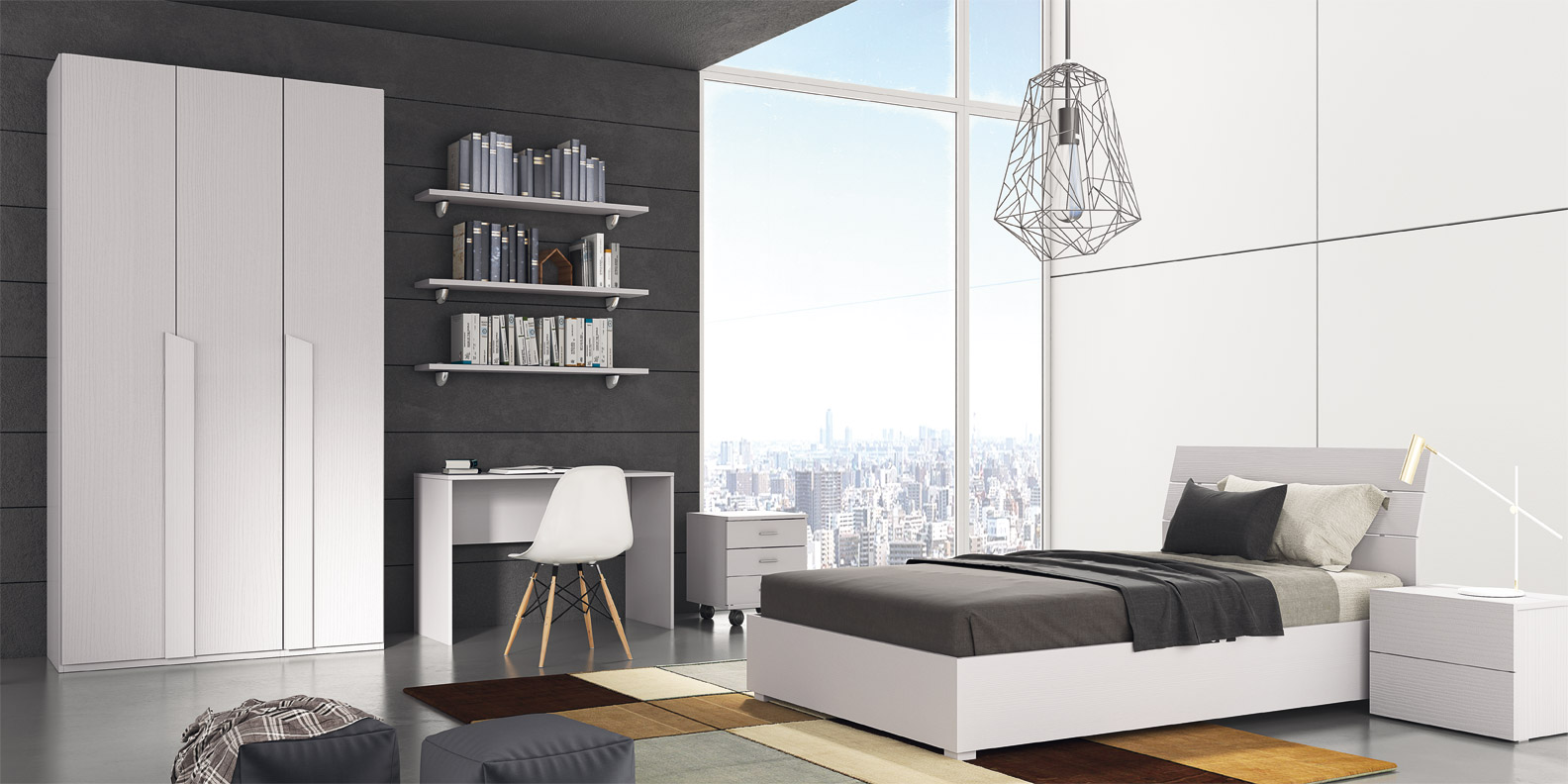 Composée de: armoire avec trois portes battantes, table de chevet avec deux tiroirs, commode à trois tiroirs sur roulettes, bureau, 3 étagères, lit de 120 cm avec rangement.