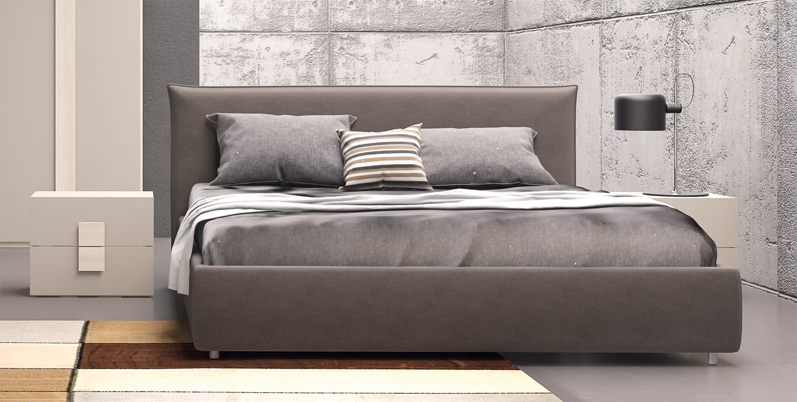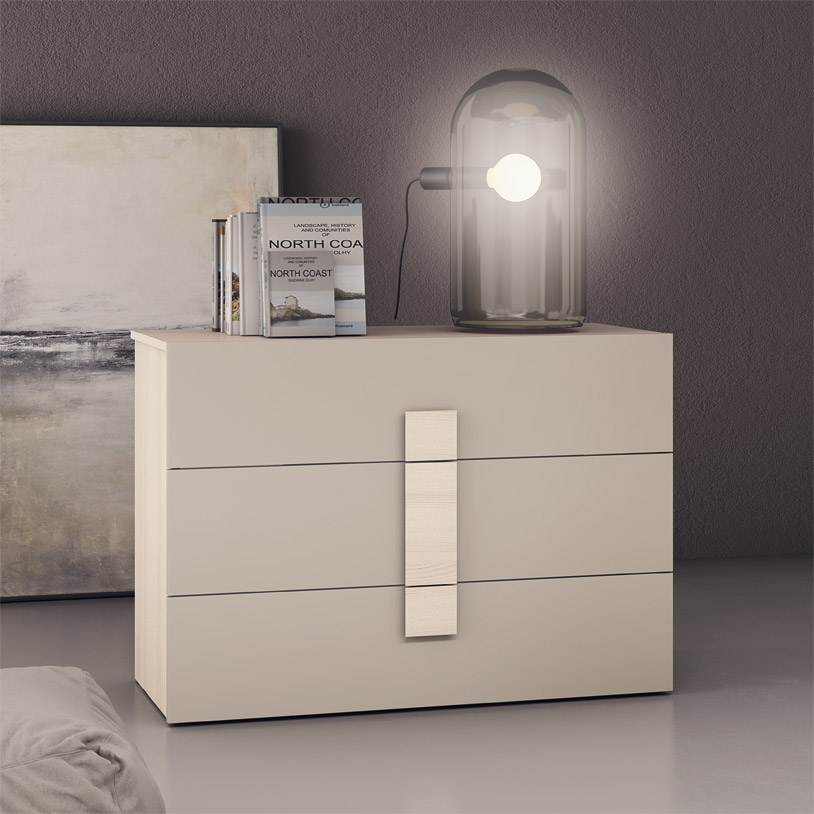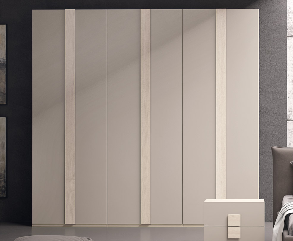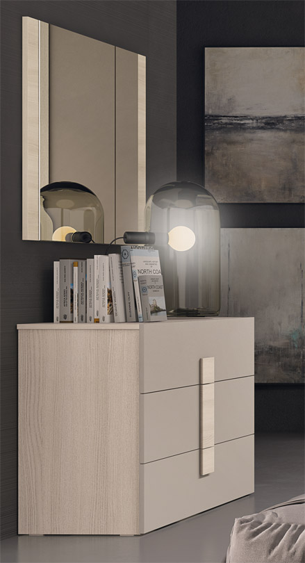 Composée d'une armoire à six portes battantes, d'une commode à trois tiroirs, de deux tables de chevet à deux tiroirs, d'un lit de rangement capitonné et d'un miroir. Présentée ici en orme et en finition gris tourterelle.